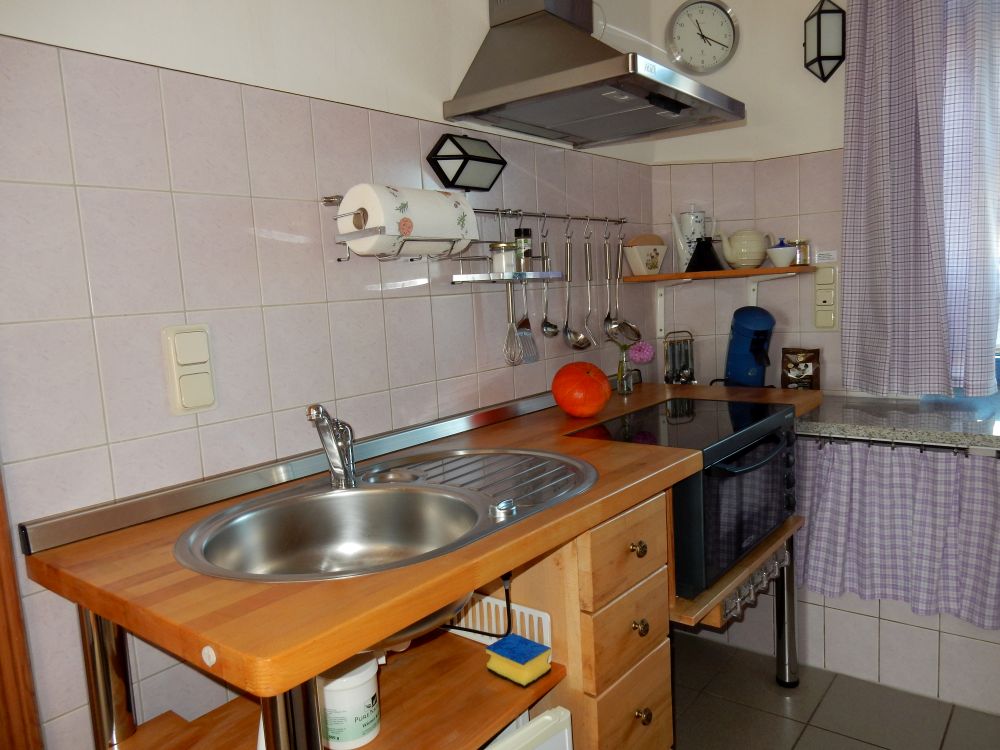 - voll ausgestattete Küchenzeile aus Massiv-Buche mit Herd inkl. Backofen, Kaffeemaschine, Wasserkocher, Pürierstab, Toaster, Geschirr und Besteck ausreichend vorhanden